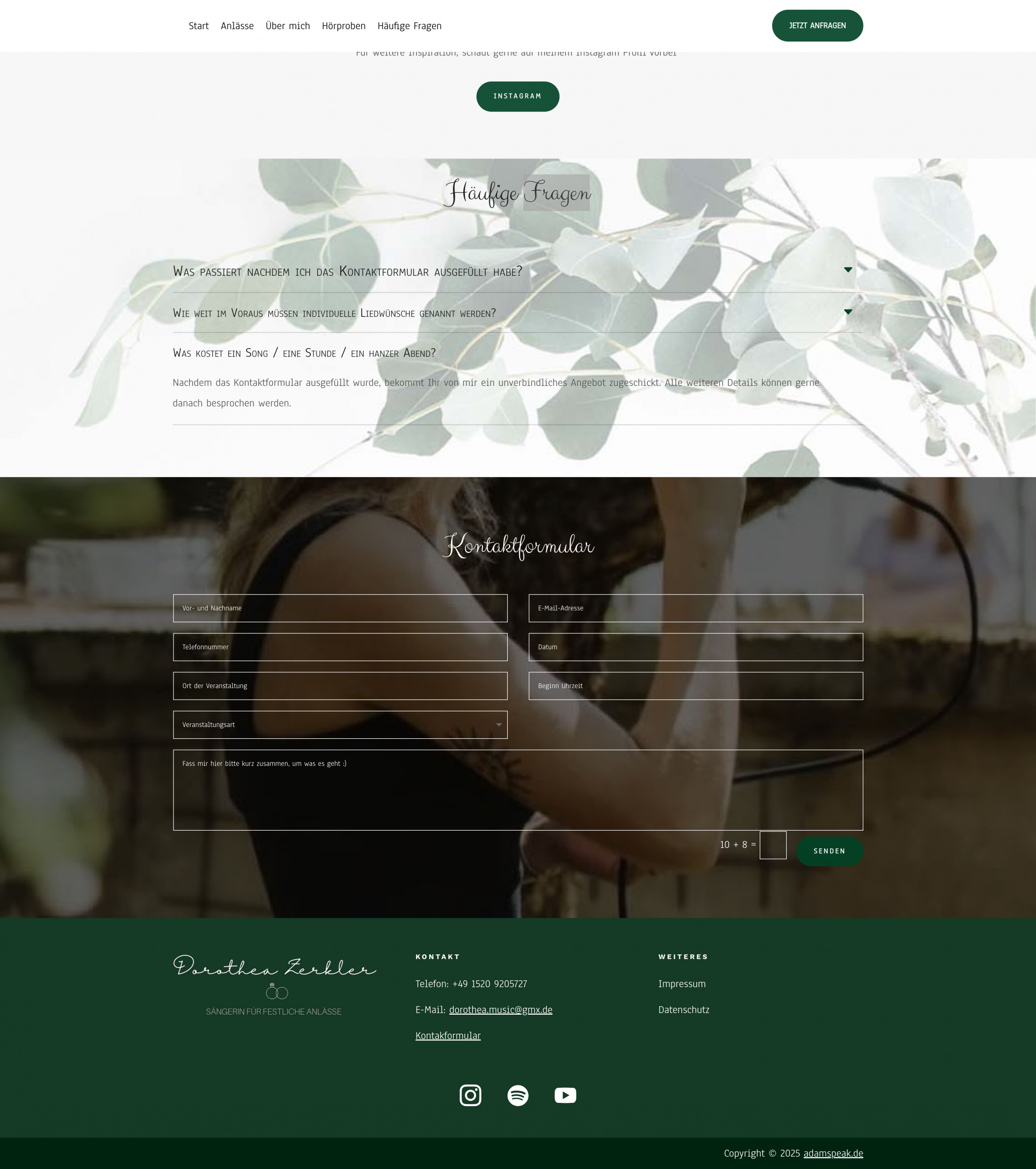Adams Peak übernahm Konzeption, Design und technische Umsetzung des One Pagers. In enger Abstimmung mit der Künstlerin entstand eine übersichtliche, visuell ansprechende Seite mit klar gegliederten Abschnitten: Vorstellung der Sängerin, Leistungsübersicht, Hörbeispiele, Referenzen sowie einfache Kontaktmöglichkeit. Das Design wurde modern, schlicht und gleichzeitig persönlich gestaltet, um die künstlerische Identität zu transportieren.