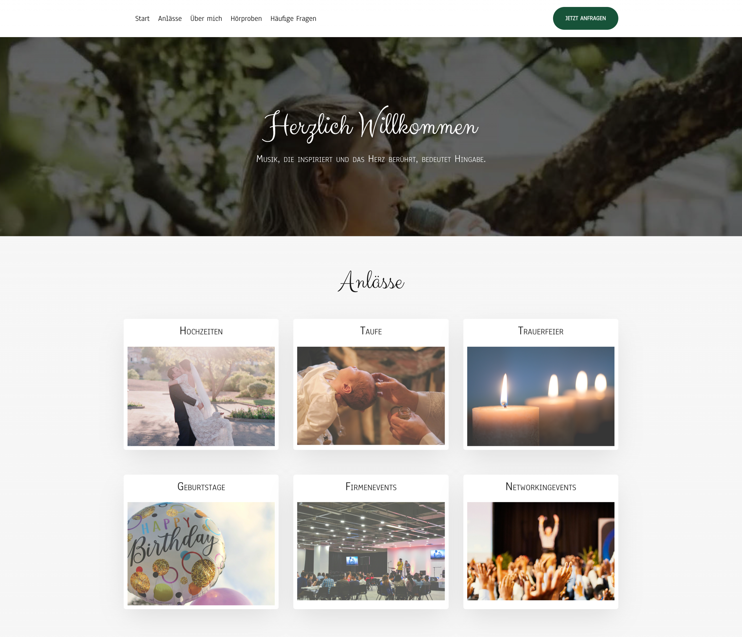 Ziel des Projekts war die Entwicklung einer modernen One-Pager-Website, die alle Leistungen auf einen Blick darstellt. Neben der Übersicht über Auftrittsmöglichkeiten sollte die Seite durch klare Struktur und ansprechendes Design Vertrauen schaffen und als zentrale Anlaufstelle für Interessierte dienen.