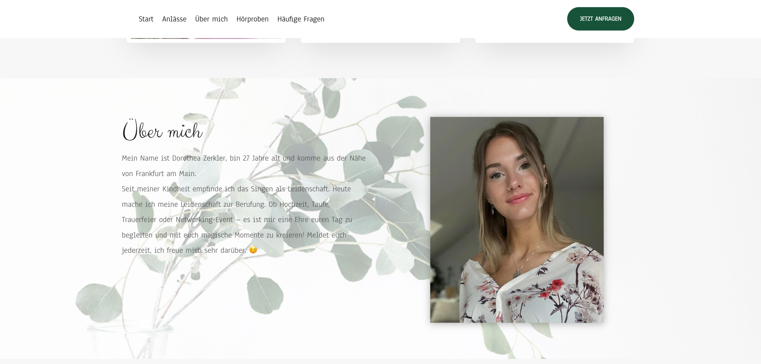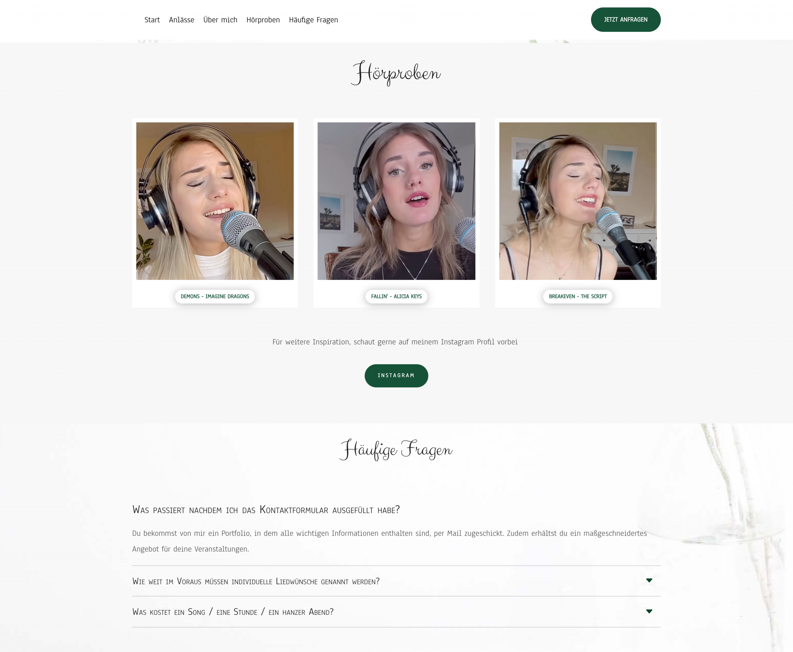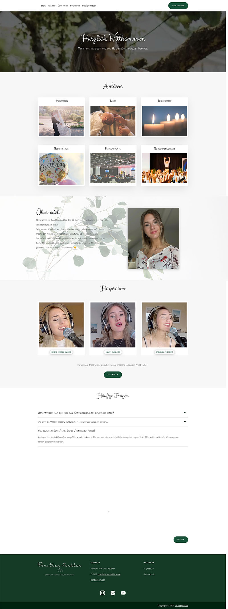 Entstanden ist ein eleganter One Pager, der alle wichtigen Informationen kompakt und benutzerfreundlich präsentiert. Besucher:innen erhalten einen schnellen Überblick über die Leistungen, können Hörproben entdecken und unkompliziert Kontakt aufnehmen. Die Seite unterstützt Dorothea Z. dabei, neue Anfragen zu gewinnen und ihre Auftritte professionell zu präsentieren.