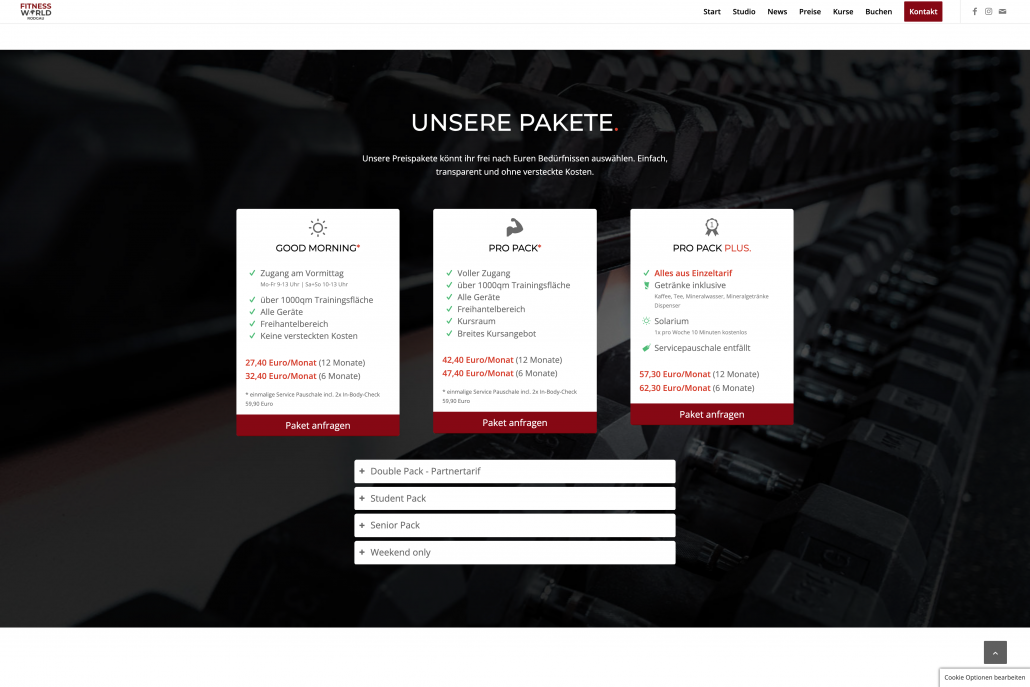 Adams Peak übernahm die Konzeption, das Design und den Aufbau der Website: Auf klare Strukturierung mit Menüpunkten wie „Studio“, „Preise“, „Kurse“, „News“ und „Kontakt“ wurde ebenso geachtet wie auf attraktive Bildwelten und einladende Texte. Highlight sind Rubriken zu den Mitgliedschaftspaketen – etwa „Good Morning“, „Pro Pack“ oder „Pro Pack Plus“ – alle übersichtlich aufbereitet, inklusive Service-Pauschalen und Benefits.