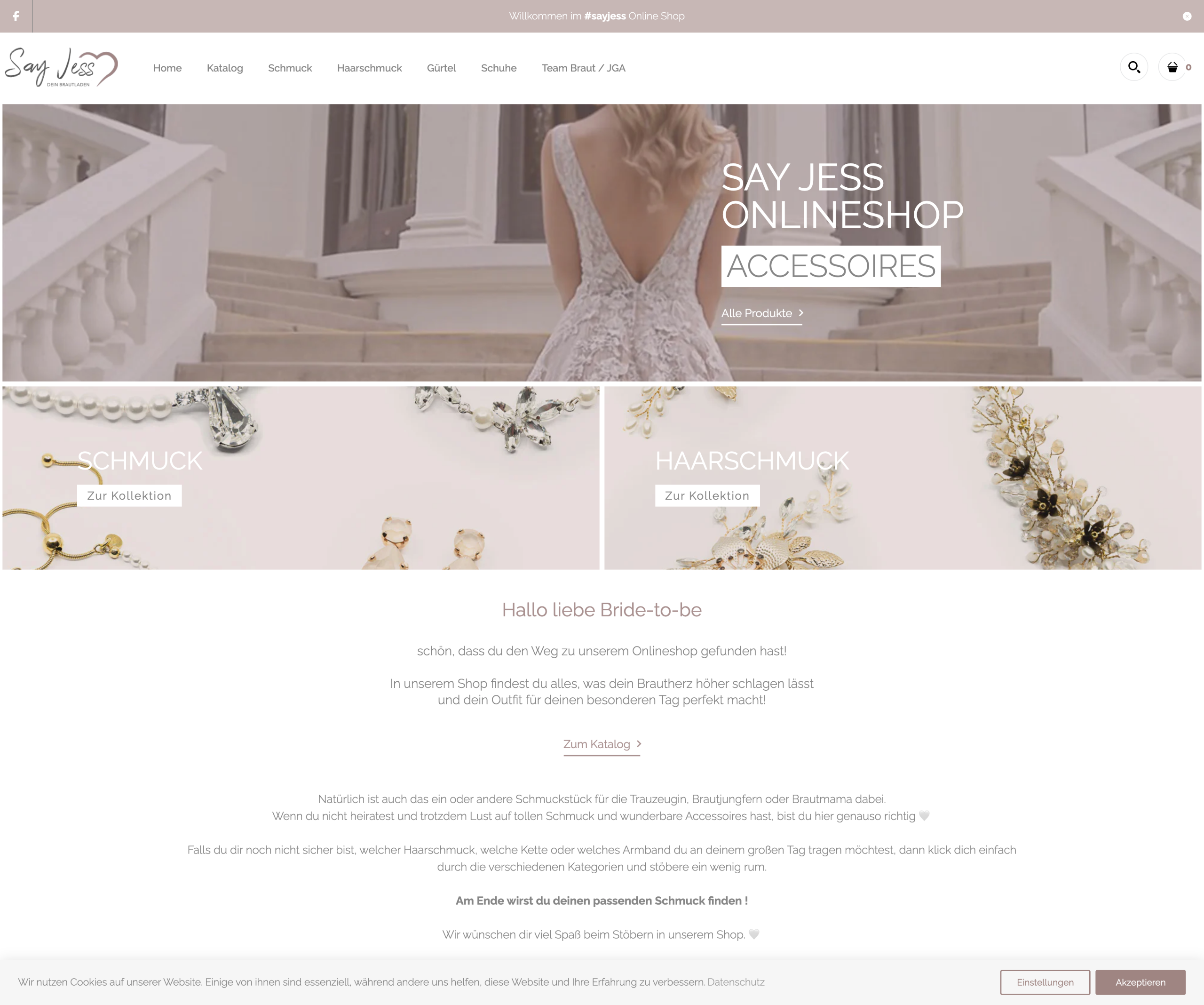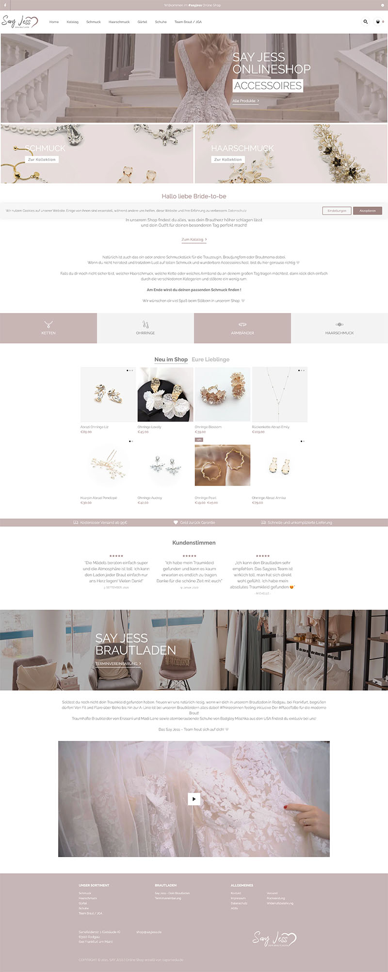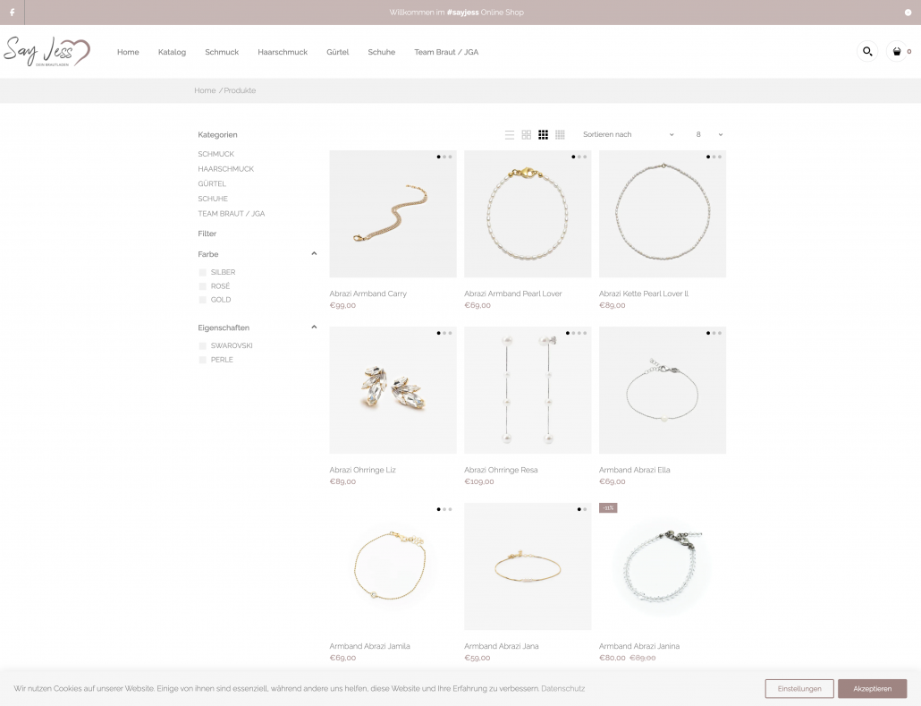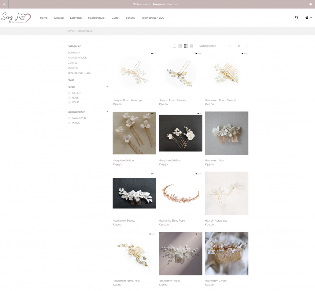 Ziel war der Aufbau eines ansprechenden Online-Shops, der Bräuten einen inspirierenden und übersichtlichen Zugang zu hochwertigen Accessoires bietet, perfekt abgestimmt auf Hochzeitsmode, klar strukturiert nach Kategorien und ausgestattet mit einem einladenden Begrüßungstext auf der Startseite des Shops.
