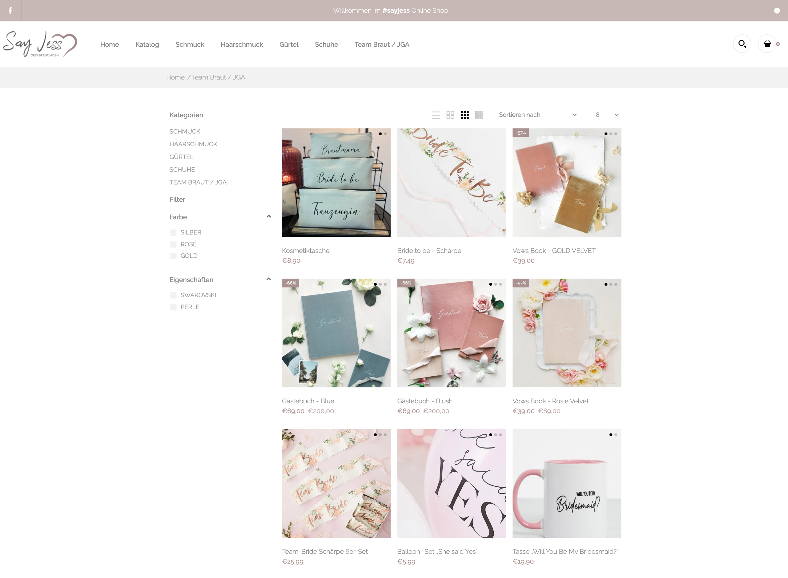 Say Jess ist ein feiner Online-Shop für Brautschmuck und Accessoires, der die Braut für ihren großen Tag stilvoll ausstattet. Von Ohrringen, Ketten, Armbändern über Haarschmuck (Diademe, Kämme, Pins, Ranken) bis hin zu Brautschuhen und, für das Team der Braut, passenden Accessoires zu Junggesellinnenabschieden: Alles ist liebevoll ausgewählt für den perfekt abgestimmten Wedding-Look.