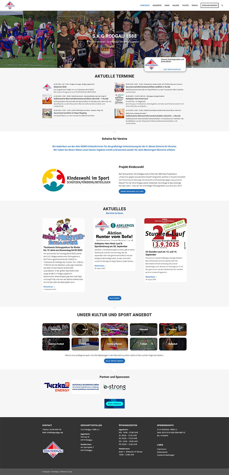 Entstanden ist eine lebendige, responsive Online-Präsenz, die das breite Angebot der S.K.G Rodgau optimal abbildet. Besucher:innen finden schnell Informationen zu Abteilungen, Terminen (z. B. „Sport im Park“, Schnupperkurse, Vereinstermine) sowie aktuelle News. Die strukturierte Darstellung stärkt das Vereinsimage, fördert die Sichtbarkeit und erleichtert die Interaktion mit Mitgliedern sowie potenziellen Interessierten. Die Zuständigen der Abteilungen können den Inhalt der Webseite selbstständig pflegen und erweitern.
